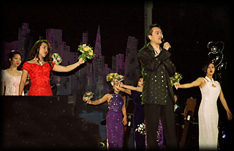 Ai Van, in a traditional "Ao Dai Tu Than" dress, pulled a reluctant music fan up to the stage. She later sang a couple of folk songs. |