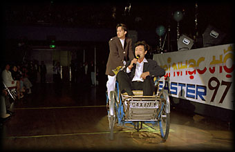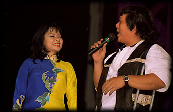 | Comedy duo Van Son and Hoai Linh, making a grand entrance on a cyclo. Talking about "Ngu+o+`i Ye^u": VS: Ngu+o+`i ye^u to^i co' mo^.t ddo^i ma('t bo^` ca^u, mo^.t con dda^.u, mo^.t con bay... HL: Co`n ngu+o+`i ye^u to^i co' mo^.t ca(.p ma('t phu+o+.ng, mo^.t con thu+o+.ng, mo^.t con ha. .... |