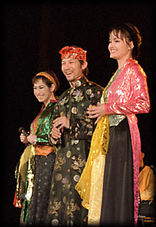 | Y Lan, Tuan Cuong (Y Lan's husband), Mai Linh (Y Lan's oldest daughter) in traditional costumes performing an elaborate skit. |